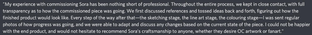 The turnaround time for each piece is different. I usually take ~10-30 hours for a fully rendered illustration. This is spread out over days. I aim for a 1-3 weeks max delivery timeframe, but it's possible for me to finish earlier. It may also take longer depending on how many commissions I need to do at once. (Please do not rush me because I will be in constant communication with you about the status of your commission!) Rest assured, you will be able to request progress pics.
