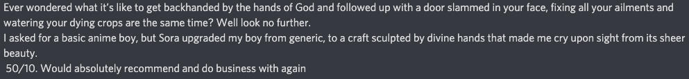 I reserve the right to post your watermarked commission piece to my social media. If you don't want it to be published or you want me to hold off on publishing it until a certain date has passed, please let me know in advance! You may post your watermarked finished commission piece on your social media as well, but please credit, tag, and @ me if you do! If you ordered from me for commercial usage, you do not need to retain the watermark, but my artist name needs to be visible on the art and linked to my account in the content of your post.